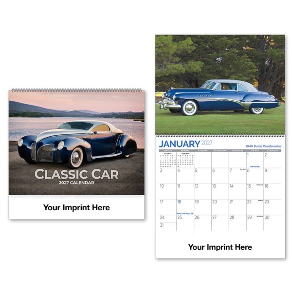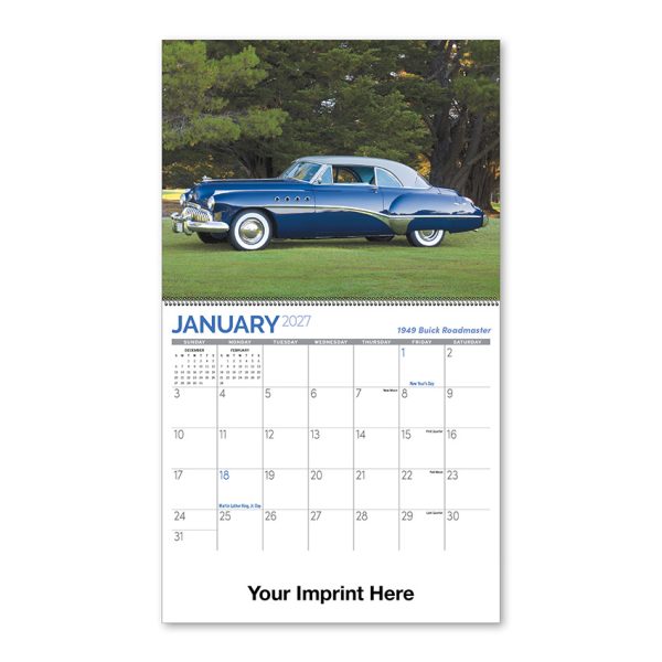 Classic cars from the ’40s, ’50s and ’60s fill this spiral bound calendar. The striking color and engaging history of each car makes this calendar a great advertising vehicle.