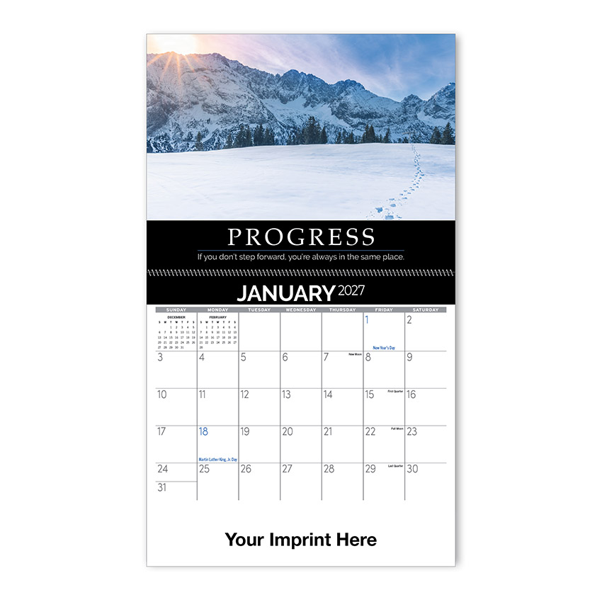 Promote optimism, teamwork and excellence this spiral bound calendar. The dynamic photographs, inspirational quotes and sleek design make this calendar prefect for motivating employees and customers. Simple date grid allows room to note appointments, events and reminders.