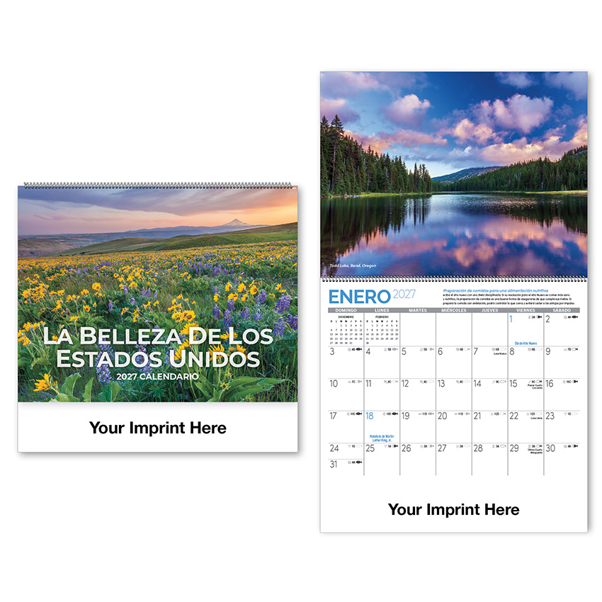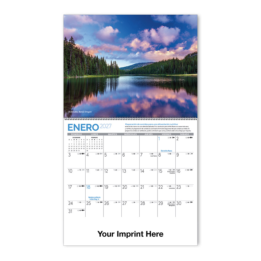 This spiral bound calendar is entirely in Spanish. The exclusive photographs in this calendar capture scenes from across the nation. Each month features farm and gardening information and all print is in Spanish.